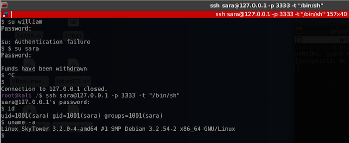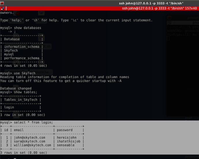 9-) Kali üzerinde proxytunnel kullandık. Proxy için başka herhangi bir araç kullanabilirsiniz. 2222.porta açtığımız proxy sayesinde artık SSH ile bağalanabiliyoruz. Ancak hala yeterli yetkimiz yok!