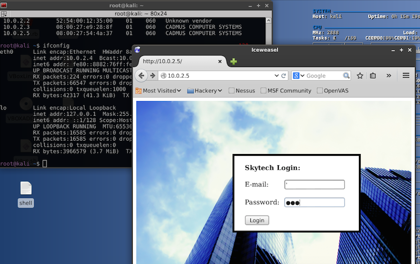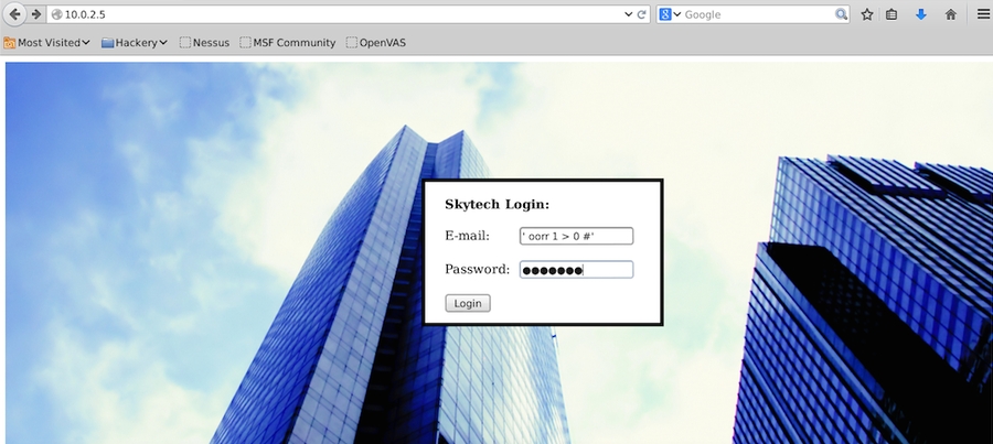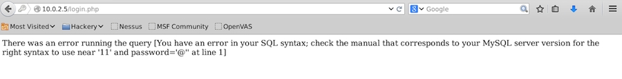 3-) 10.0.2.5 IP’sinin 80 portunda şekildeki gibi bir login ekranı geliyor. Haliyle login ekranı görüldüğü an tırnak (‘) atmak alışkanlık.