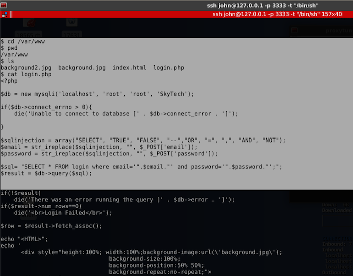 11-) Sistemde bir login ekranı olduğuna göre kodlar içerisinde database connection kodları arasında db için kullanıcı adı ve parola bulabiliriz. login.php içerisinde localhost üzerindeki mysql database kullanıcı adının ‘root’ parolanın da ‘SkyTech’ olduğunu görüyoruz.
