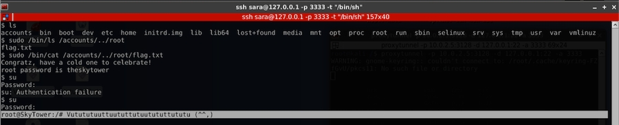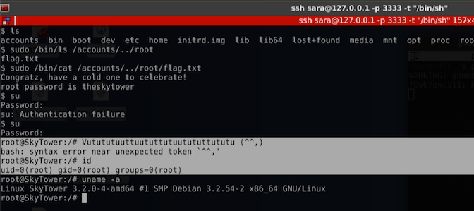 16-) accounts dizinini görüntüleme yetkimiz var. O halde basit bir kandırmaca ile herhangi bir yetki yükseltme yöntemi denmeden önce /root/flag.txt dosyasını okutmaya çalışıyoruz. Ve işe yarıyor. Tabii Vututututututu benim sevinme şeklim. root parolasının ‘theskytower’ olduğunu öğreniyoruz.