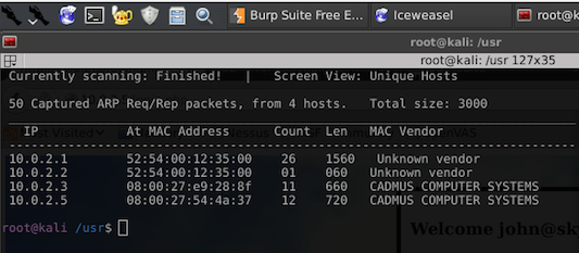 1-) Sanal ortamda makinenin IP’sini bulmak için netdiscover kullanıyoruz.